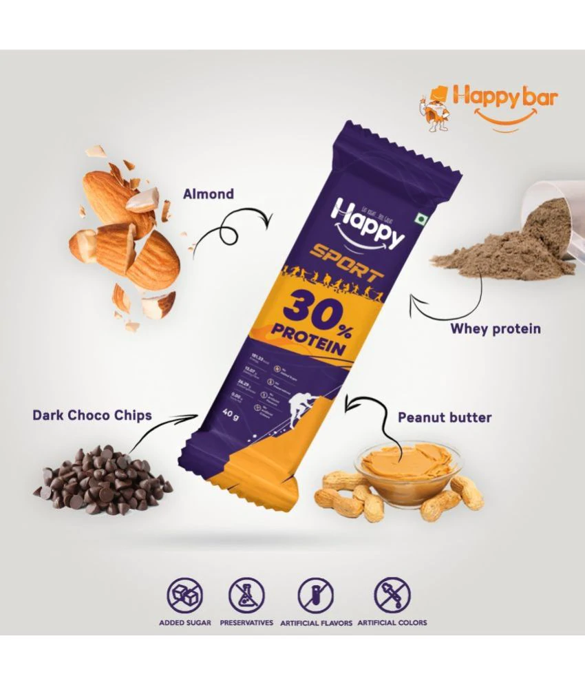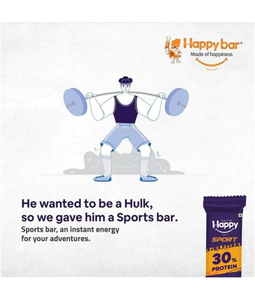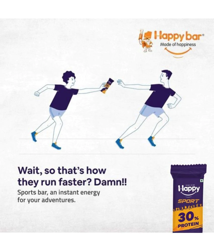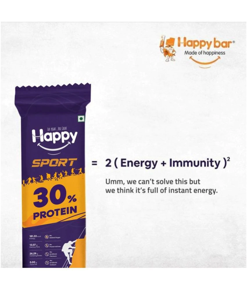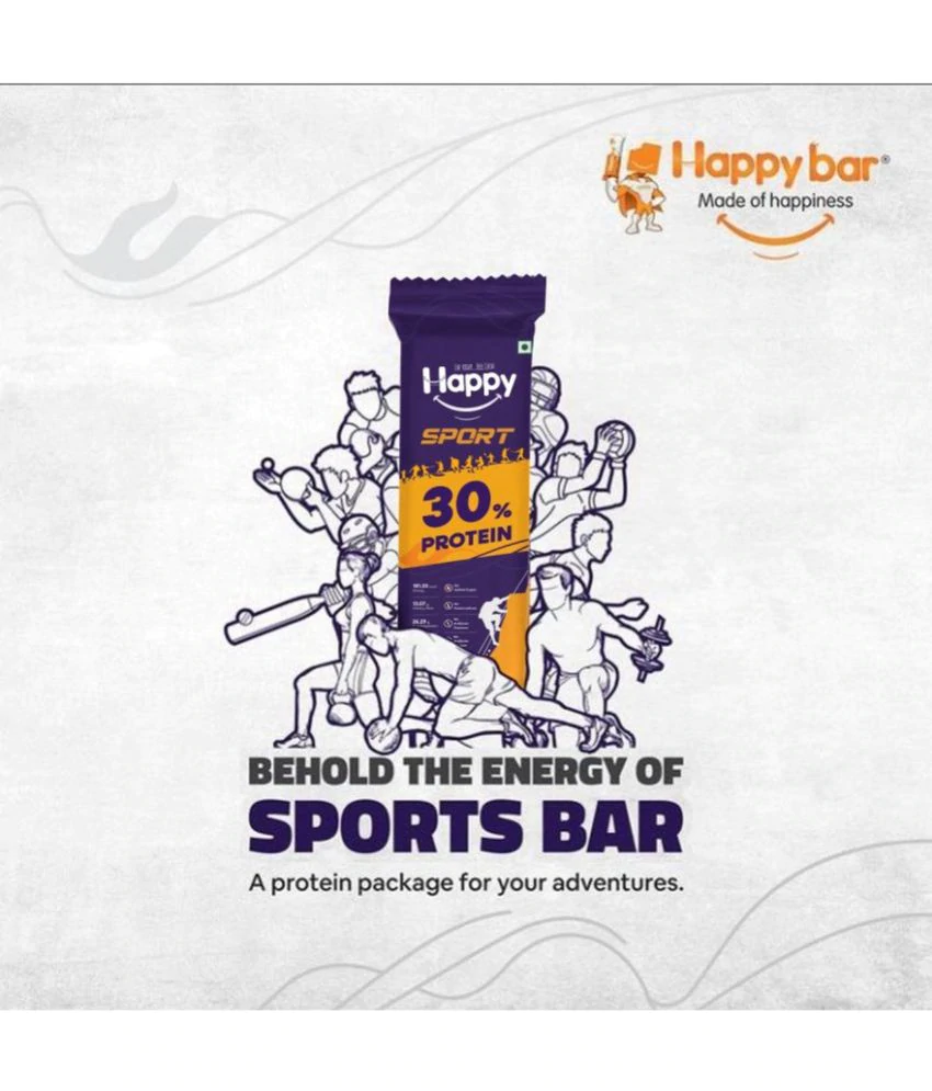 Happy Bar Sport is a delicious yet nutritious energy bar with12 gm of protein,13 gm of fibre and the awesome taste in every bite.