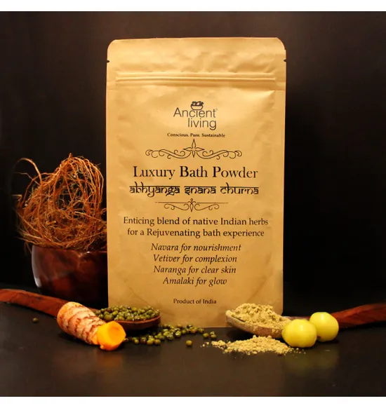 Ancient living ayurvedic luxury bath powder (ubtan) is made of healing navara rice, mudga, musta, vidanga, ushira, amalaki, haritaki, kasturi harida, bakuchi, shati, chickpea, naranga, & vibhitaki. This medley of 13 herbs makes it a very uplifting bathing experience. Navara rice used in classical ayurvedic treatments is cultivated only in kerala great for exfoliation.