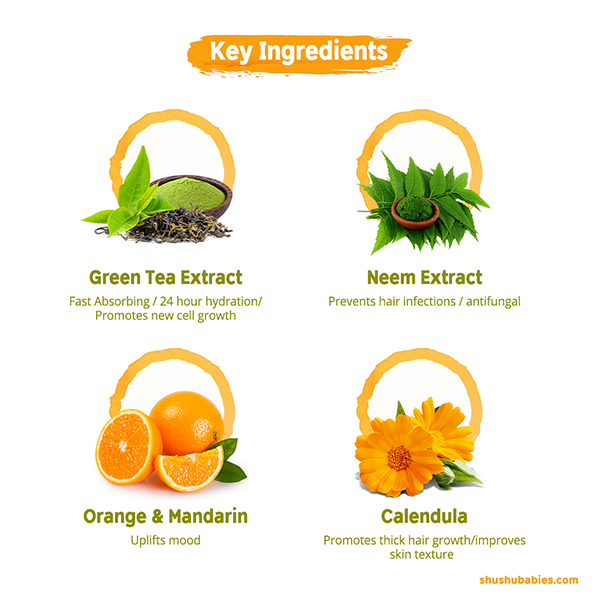 Hi. I am a super hydrating shampoo and body wash with a tear-free formula enriched with the perfect blend of Ayurvedic goodness of orange and mandarin. I am dermatologically tested, clinically proven, 100% vegan, and free from all toxic chemicals, which makes me completely safe for your little munchkin. Using me for everyday bath time cleansing will remove all the dirt and improve skin complexion with the blend of orange and mandarin making it perfect for everyday use. I help to promote healthy hair growth, prevent skin dryness, moisturize the scalp, strengthen the hair follicles, treat dryness and also make your baby’s hair softer, silkier and shinier.