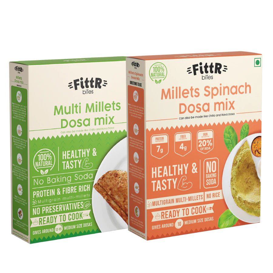 Having sumptuous meal is very important for us to race through the day. But sometimes in your daily rush we all try to take shortcuts or skip it. With our ready to cook wholesome meals, you can now have yummy, nutritious and just like homemade meal ready in 5 to 10 minutes for you and your loved ones. FittR biTes Wholesome meals combo includes: 1 box of Spinach Millets dosa mix (250 gm) 1 box of Millet dosa mix (250 gm)